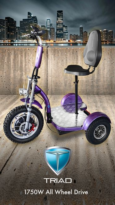 The Triad 750 AWD is fully integrated Front wheel drive 750W motor, with 1000W Dual Rear Drive motors combine to provide 1750W total motor power with All-Wheel Drive action (5250W peak power) including a variable throttle to go 0-25 mph with all wheel disc brakes.